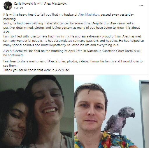 The devastating news was shared by Alex’s wife Carla Kowald on Facebook,