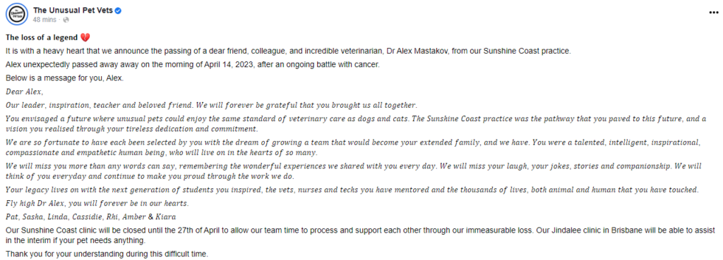 The Unusual Pets Vet clinic also wrote about the loss of their director on Facebook,