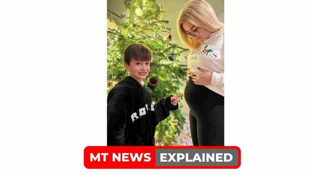 In the endearing photo, Freddie, Amy’s stepson, can be seen grinning ear to ear while pointing to Amy’s growing bump in front of the Christmas tree.