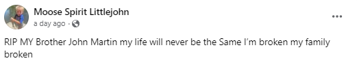 “RIP MY Brother John Martin my life will never be the Same I’m broken my family broken”