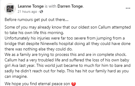 We as a family are trying to process this and are in complete shock. Callum had a very troubled life and suffered the loss of his own baby girl Ava last year. This world just became to much for him to bare and sadly he didn’t reach out for help. This has hit our family hard as you can imagine.