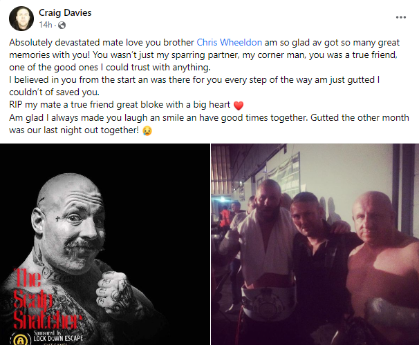 “Absolutely devastated mate love you brother Chris Wheeldon am so glad av got so many great memories with you! You wasn’t just my sparring partner, my corner man, you was a true friend, one of the good ones I could trust with anything.