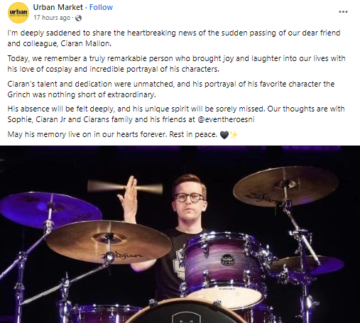 “I’m deeply saddened to share the heartbreaking news of the sudden passing of our dear friend and colleague, Ciaran Mallon.