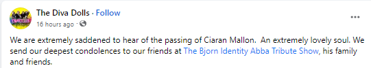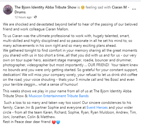 On Facebook, the Bjorn Identity Abba tribute show band posted a moving remembrance of their dear friend and drummer Ciaran Mallon.