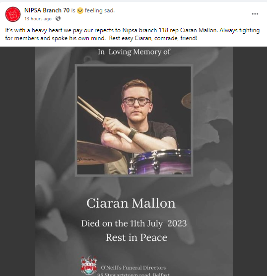NIPSA branch 118 CastleCourt & College wrote: “It is with a heavy heart that I make this announcement. Our comrade, friend and Branch 118 rep Ciaran Mallon passed away today. As the branch secretary, on behalf of our committee and members, would like to offer our condolences and deepest sympathies to his family and loved ones at this time. He will be greatly missed. Rest In Peace Ciaran.”