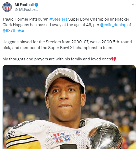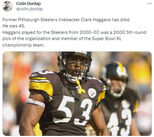 John Walker wrote: “Terrible news. Former Steelers linebacker Clark Haggans has passed away at the age of 46. Rest In Peace, Champ.”
