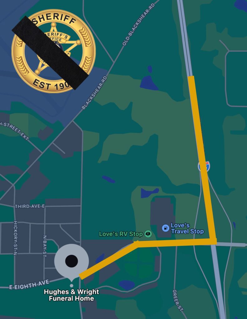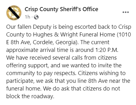 The deceased deputy is being transported back to Crisp County to Hughes & Wright Funeral Home (1010 E 8th Ave, Cordele, Georgia), according to the Crisp County Sheriff’s Office. At this moment, it will arrive about 1:20 PM.