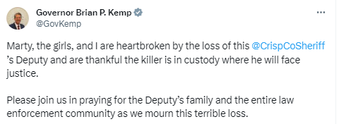 “Marty, the girls, and I are heartbroken by the loss of this@CrispCoSheriff’s Deputy and are thankful the killer is in custody where he will face justice. Please join us in praying for the Deputy’s family and the entire law enforcement community as we mourn this terrible loss.”