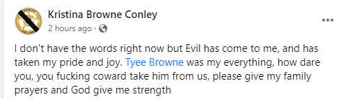 “I don’t have the words right now but Evil has come to me, and has taken my pride and joy. Tyee Browne was my everything, how dare you, you fucking coward take him from us, please give my family prayers and God give me strength.”