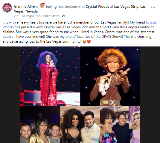 “The World of drag lost a true icon today. If you have ever seen a Diana Ross impersonator in Las Vegas over the past 40 years, chances are it was Crystal Woods. Rest in peace Diva.”