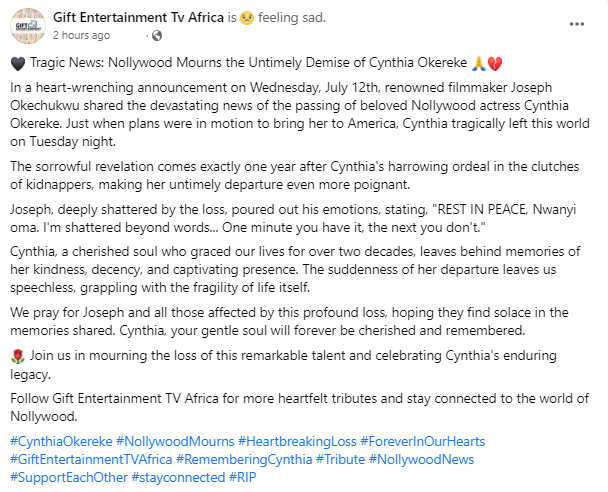 David Offer wrote: “RIP veteran Nollywood icon, Cynthia Okereke!! Life remains a mystery”