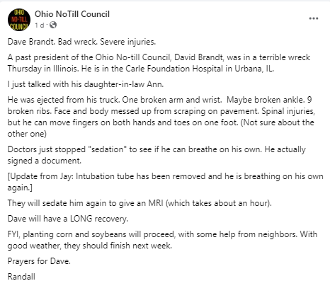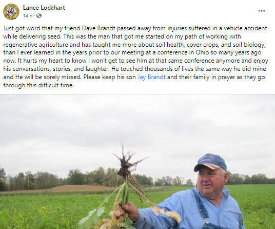 “Just got word that my friend Dave Brandt passed away from injuries suffered in a vehicle accident while delivering seed.