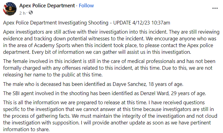 The guy who was killed and the SBI officer who shot him outside an Academy Sports on Tuesday have both been identified by the Apex Police Department. Dayve Sanchez, 18, was allegedly caught stealing, and a State Bureau of Investigation agent shot and killed him on Tuesday afternoon in Apex, according to the town’s police department. Let’s see about it in detail.