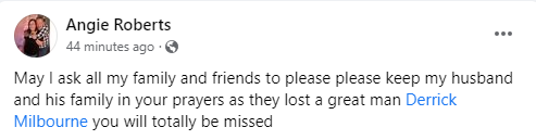 “May I ask all my family and friends to please please keep my husband and his family in your prayers as they lost a great man Derrick Milbourne you will totally be missed.”