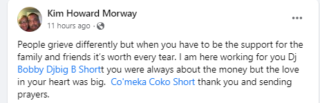 “People grieve differently but when you have to be the support for the family and friends it’s worth every tear. I am here working for you Dj Bobby Djbig B Shortt you were always about the money but the love in your heart was big. Co’meka Coko Short thank you and sending prayers.”