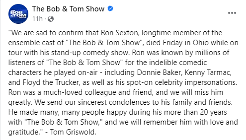 Tom Griswold wrote: “We are sad to confirm that Ron Sexton, longtime member of the ensemble cast of “The Bob & Tom Show”, died Friday in Ohio while on tour with his stand-up comedy show. Ron was known by millions of listeners of “The Bob & Tom Show” for the indelible comedic characters he played on-air – including Donnie Baker, Kenny Tarmac, and Floyd the Trucker, as well as his spot-on celebrity impersonations. Ron was a much-loved colleague and friend, and we will miss him greatly. We send our sincerest condolences to his family and friends. He made many, many people happy during his more than 20 years with “The Bob & Tom Show,” and we will remember him with love and gratitude.”