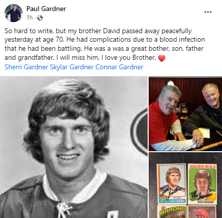 “Sad news today, a dear friend my hockey buddy former NHLer former Molson rep and truly great guy Dave Gardner passed away- he will be missed.”