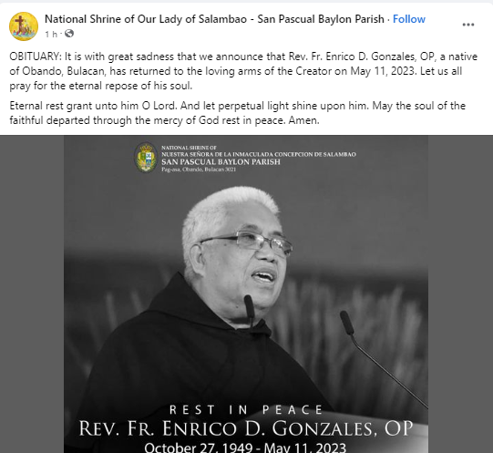 Minor Basilica of Our Lady of Manaoag wrote: ” Please join us in praying for the eternal repose of the soul of this humble servant of God. May 11, 2023. Eternal rest grant unto Rev. Fr. Enrico Gonzales, O.P., O Lord, and let perpetual light shine upon him. May he rest in peace. Amen. May almighty God bless us with his peace and strength, the Father and the Son and the Holy Spirit.”