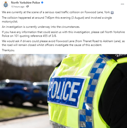 “We are currently at the scene of a serious road traffic collision on Foxwood Lane, York.