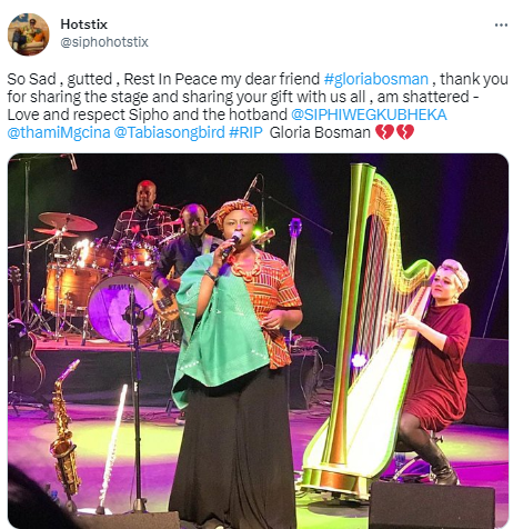 “So Sad , gutted , Rest In Peace my dear friend #gloriabosman , thank you for sharing the stage and sharing your gift with us all , am shattered – Love and respect Sipho and the hotband @SIPHIWEGKUBHEKA @thamiMgcina @Tabiasongbird #RIP Gloria Bosman 💔💔”
