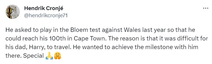 Etzebeth requested to play against Wales in Bloemfontein last season so that his father could watch him make his 100th appearance in Cape Town the following week, according to Cronje.