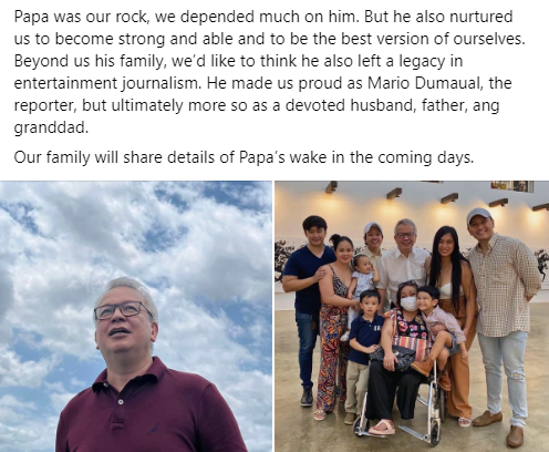 “We are devastated to announce the passing of Mario Dumaual — Papa to his wife Cherie and children Luigi, Miguel, Maxine, William, and Thessa; Wowo to his grandchildren Sky, Alonzoe, and Tali; and Yayo to his siblings.