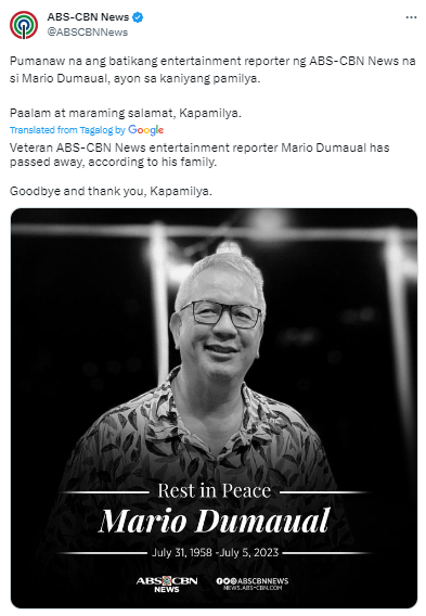 “Veteran ABS-CBN News entertainment reporter Mario Dumaual has passed away, according to his family.