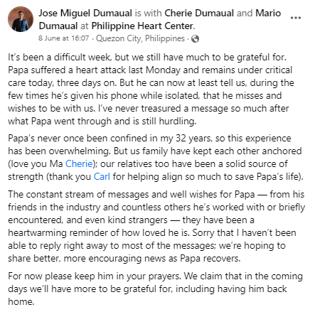 “It’s been a difficult week, but we still have much to be grateful for. Papa suffered a heart attack last Monday and remains under critical care today, three days on. But he can now at least tell us, during the few times he’s given his phone while isolated, that he misses and wishes to be with us. I’ve never treasured a message so much after what Papa went through and is still hurdling.