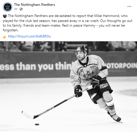 The Nottingham Panthers are devastated to report that Mike Hammond, who played for the club last season, has passed away in a car crash. Our thoughts go out to his family, friends and team-mates. Rest in peace Hammy – you will never be forgotten.