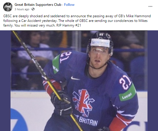 Ice Hockey UK referred to Hammond as a “cherished GB team-mate” in a statement.