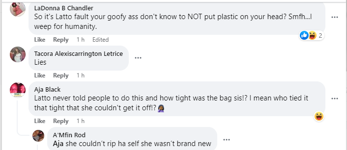 That have nothing to do with the rapper. 1) she has people around her tearing the plastic off of her. 2) it’s a song I’m sure the person who came up with the video chose to do that. 3) My 2 year old is smarter than this grown woman. 4) the rapper did not start the challenge. The people are using loosely bags for the challenge. The video the plastic on there is not completely sealed there is air coming up into the plastic. Who would do a challenge so stupid without someone with them. Nobody is putting a bag on their head tight neither. People is so lazy instead of getting a job she’s trying to get pay even though her sister whom I am sure was grown decided to put a tight bag on her head. Smh next I guess they are going to start sueing WWE! I feel bad for the family but get for real. Let your sister rest in peace she made that choice.