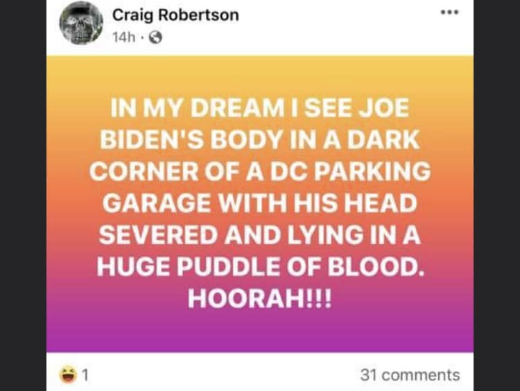 Authorities claim Robertson wrote in a September 2022 Facebook post that was included in the documents, ” The time is right for a presidential assassination or two. First Joe then Kamala!!! ”