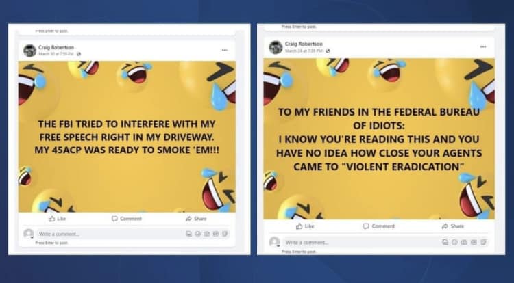 Robertson stated in a different undated social media post that was referenced in the document: “Hey FBI, you still monitoring my social media? Checking so I can have a loaded gun handy in case you drop by again.”
