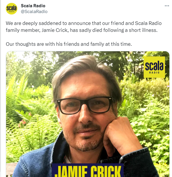 Kieren Mcgary wrote: “Shocked and saddened to hear that Jamie Crick has died. I first worked with him at the then BBC Radio Bedfordshire where I did some part time work while at college. He was always friendly and encouraging. Some years later I worked with him again at Classic FM. RIP”