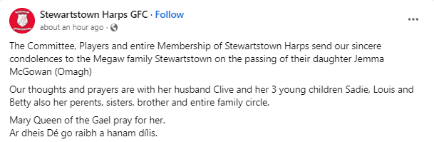 “The Committee, Players and entire Membership of Stewartstown Harps send our sincere condolences to the Megaw family Stewartstown on the passing of their daughter Jemma McGowan (Omagh)