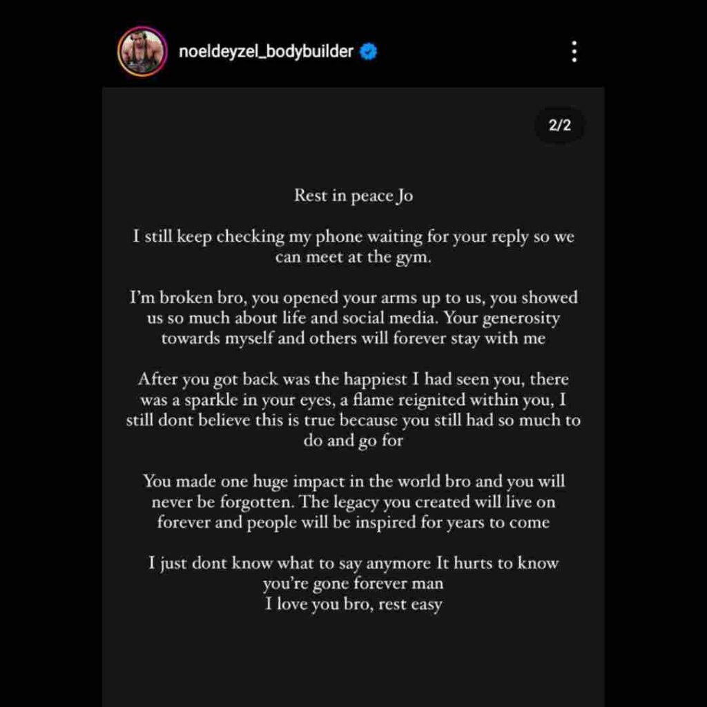 However, the news of his passing shocked his friends and admirers. Noel Dezyel, a fellow bodybuilder, announced the awful news via an Instagram post in which he expressed his profound sorrow and praised Jo for her generosity, spark, and enduring legacy.