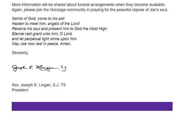 Michelle Marie Wilson wrote : “I am so sad and shocked to hear of your sudden passing Joe Reyda. THANK YOU for everything you did and role modeled for my son. My prayers for the entire Reyda family. #gonzagafootballfamily #GonzagaFamily 💔💜💔💜💔💜”
