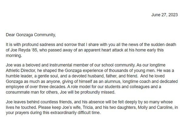 Joe Reyda reportedly suffered a heart attack and died. Joe was a much-loved and valuable contributor to Gonzaga school community. He influenced thousands of young men’s Gonzaga experiences as veteran athletic director. He was an honorable leader who had a kind heart.