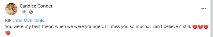 Candice Corner wrote: “RIP John Mcnichols You were my best friend when we were younger.. I’ll miss you so much.. I can’t believe it still. 💔💔💔💔