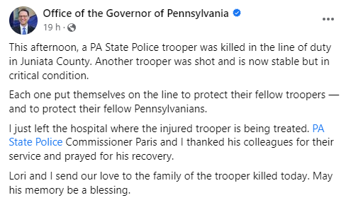 “This afternoon, a PA State Police trooper was killed in the line of duty in Juniata County. Another trooper was shot and is now stable but in critical condition.