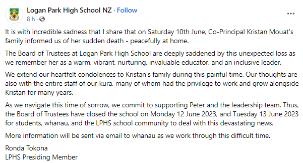 Politician Michael Woodhouse MP wrote: “Very sad to learn of Kristan’s passing. I caught up with Kristan and co-Principal Peter just last Friday and was really impressed with their partnership and leadership. My sincere condolences to her family and the wider LPHS whanau.”