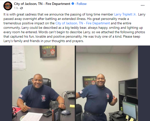 The long-time member Larry Triplett Jr. of the City of Jackson, Tennessee, Fire Department passed away overnight following an extended illness, the department reports on Facebook.