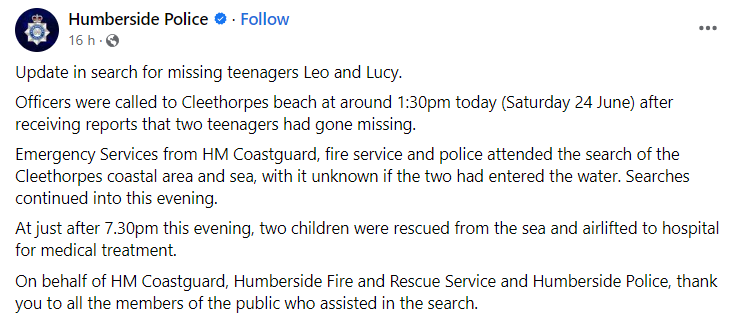 On behalf of HM Coastguard, Humberside Fire and Rescue Service and Humberside Police, thank you to all the members of the public who assisted in the search.”
