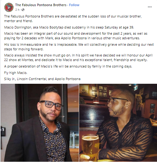 The tragic passing of beloved musical brother, mentor, and friend has left The Fabulous Pontoona Brothers inconsolable. Macio Dorrington, also known as Macio Bootytap, passed away unexpectedly on Saturday at the age of 39.