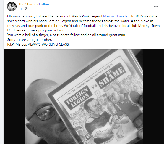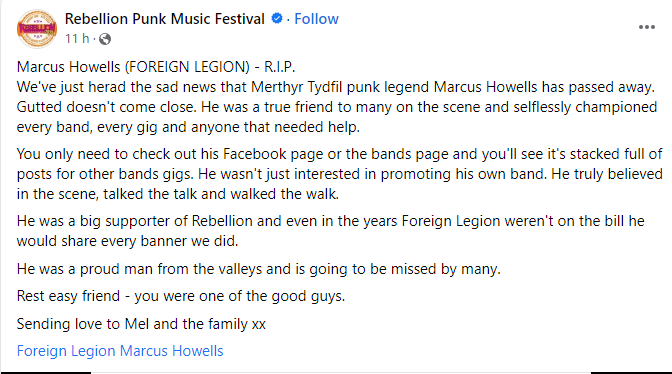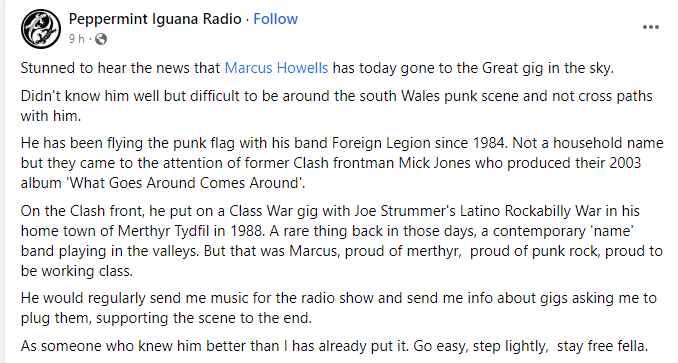 Front man with Merthyr Punk stalwarts, Foreign Legion for close on 40 years, got to know him whilst on holiday in Weymouth back in June 79 and have stayed in touch ever since. A passionate fan of Merthyr Tydfil/Town FC and QPR as well as our beloved Wales, we only chatted on here recently. Ironically, posted this pic from Memories about 3 weeks ago, know he’s been ill a while but truly shocked to hear we’ve lost him. The world just became a poorer place. Sleep well my Friend. Go Easy. Step Lightly. Stay Free”