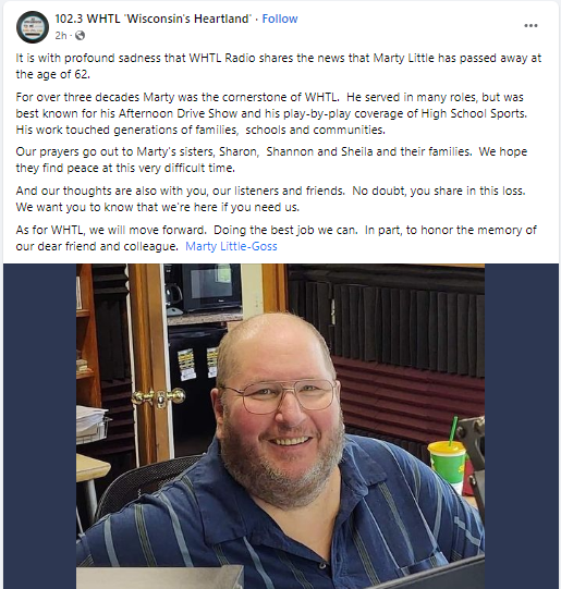 Marty Little passed away at age 62. 102.3 WHTL ‘Wisconsin’s Heartland’ shared the devastating news on Facebook,