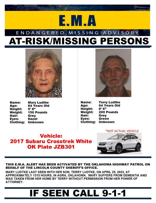 Mary Ludtke and her son Terry Ludtke were last seen in Agra, Oklahoma, on April 25, 2023, about 1:15 p.m., according to OHP.