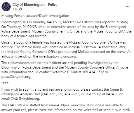 The Illinois Emergency Management Agency, the Bloomington Police Department, and the McLean County Sheriff’s Office conducted a thorough search to find the body of 39-year-old Melissa Sue Ostrom, according to a news release.