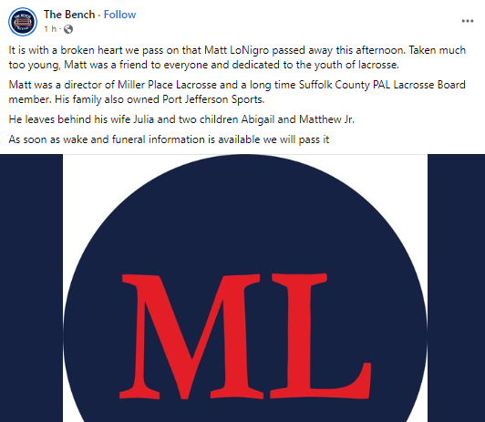 The Miller Place Lacrosse director, Matthew LoNigro, has passed away.