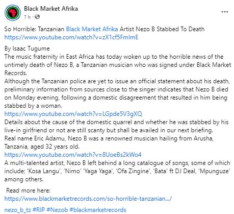 The Black Market Records, with whom Nezo B worked, stated the tragedy and expressed their condolences on Facebook.